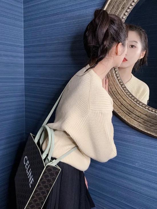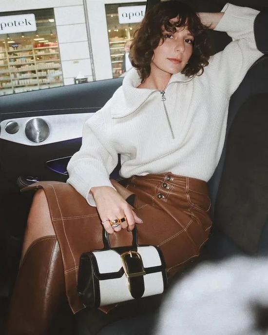 Mini包袋的作用可以减轻整体造型的重量,用轻盈的小型手袋来中和毛衣的厚重会使整个人看来起精致许多。