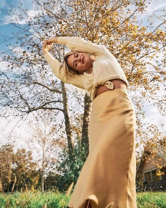 缎面和雪纺面料的长裙很适合搭配厚实的毛衣,能极大程度上减少毛衣的"笨重",避免全身从头到脚视觉重量过重。