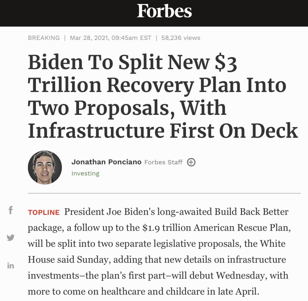 根据福布斯的报道,这个名为"Build Back Better"的经济复苏计划,将分为两个单独的立法提案。第一部分是关于解决美国基建的问题,如道路桥梁重建、网络宽带拓宽等基础建设,第二部分则涉及医疗保健和儿童保育。