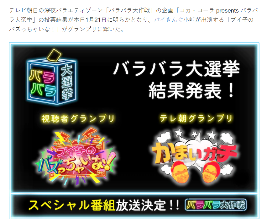 2021年1月,朝日电视台针对旗下的十四档深夜节目,发起了名为"BARABARA大选举"的企划,这十四档节目将通过观众投票为自己赢得"增加制作经费、提早播放时间"的福利。