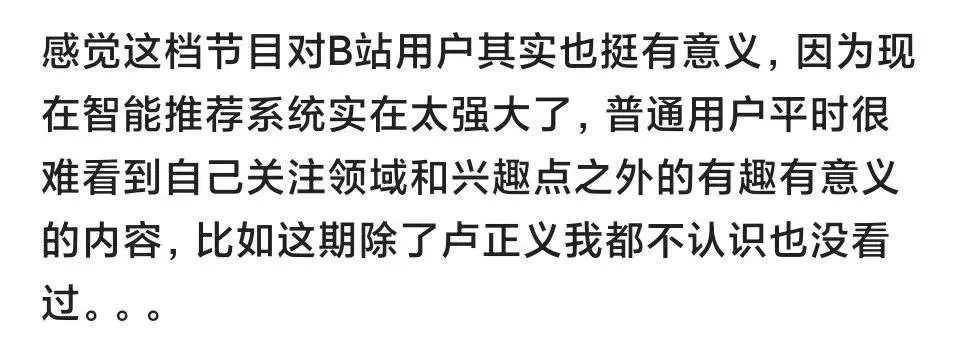 有不少B站观众也深感节目内容的多样,"这个节目真的让我见识了很多没看过的好视频""从这里认识了很多新的UP主"。
