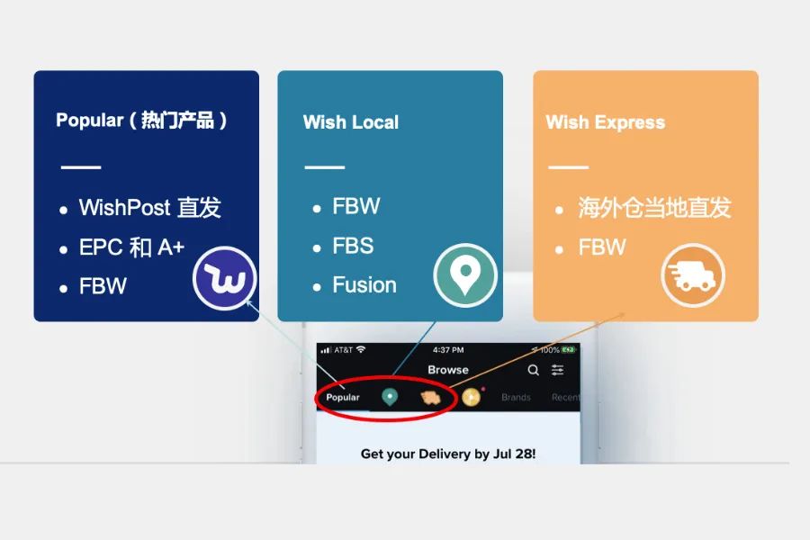 打开Wish APP,首页第一个标签页"Popular"中基本涵盖了Wish平台上所有的产品,包括通过WishPost、EPC、A+等直发的产品和海外仓的产品;绿色的"定位指针"标签页中的产品都是提供线下门店自取的产品,在用户端,Wish称之为Wish Local项目,主要由FBS项目、FBW海外仓及Blue Fusion这样的物流方式来支持;黄色的"物流车"标签页中的产品都是海外仓产品,主要是Wish Express海外仓和FBW海外仓产品。