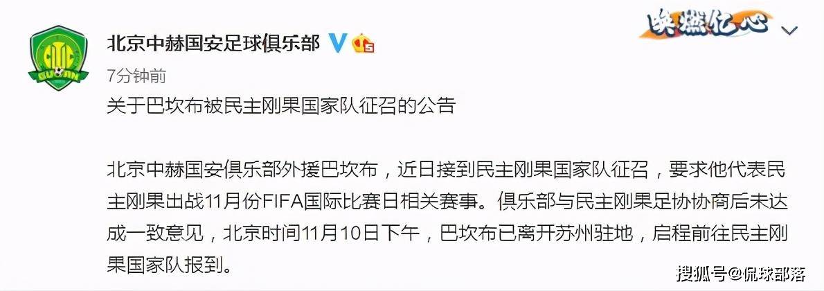 原标题:官宣!中超金靴头号热门提前离开:最后一场不踢了,亚冠也不参加今晚,北京国安俱乐部官方宣布,外援巴坎布今天下午离开苏州赛区,启程前往民主刚果国家队报到。这样意味着原本有机会争夺中超金靴的巴坎布,提前放弃这个荣誉,与此同时,下周开打的亚冠东亚区比赛,巴坎布也不参加了,让北京国安锋线实力折损不少。关于巴坎布被民主刚果国家队征召的公告,北京国安俱乐部是这样写道:"北京中赫国安俱乐部外援巴坎布,近日