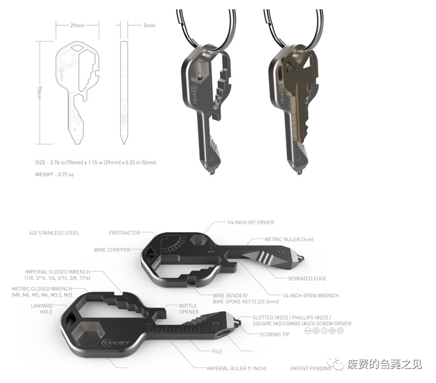 Geekey(24合1多功能钥匙扣)是一款非常多功能的产品,它不仅方便携带外观帅气,它的功能还十分众多,它除了可以充当螺丝刀、扳手、小刀、开瓶器甚至还可以用作烟斗使用,也因为这些优点,使得它深受大众的喜爱,但是不要因此而盲目复制,它可是集商标,专利和版权为一体,你的复刻可能会让律所"闻风而至",从而收到一封冰冷的律师通知信。