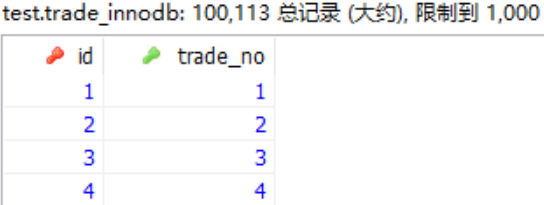 分别创建不同引擎的表trade_myisam、trade_innodb,并插入10万条测试数据,如下: