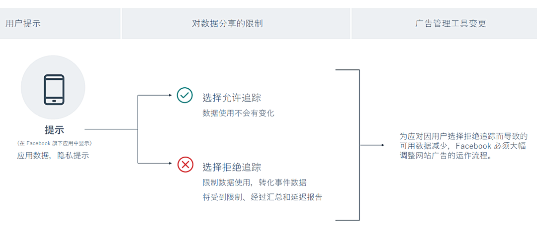 具体影响既然苹果提了接受追踪和拒绝追踪的选项,必然会有用户选择后者,这就导致了原有的公共流量减少——Facebook 必须大幅调整网站广告的运作流程,这一次调整直接影响了卖家们在网页上投放广告,包括影响广告工具的设置、受众定位、优化及成效衡量。Facebook广告和商业产品副总裁 Levy 提道,具体将会有以下负面影响(点击此处阅读原文):