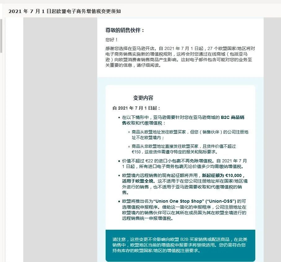 根据亚马逊邮件,自2021年7月1日起,欧洲增值税将会有以下4条重点变更内容: