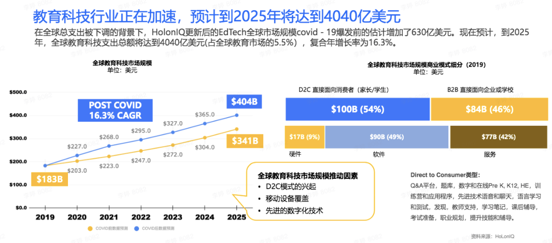到2025年,全球教育和培训市场的总支出将达到7.3万亿美元。全球教育科技领域市场规模在2025年将达到4040亿美元,复合年增长率为16.3%。