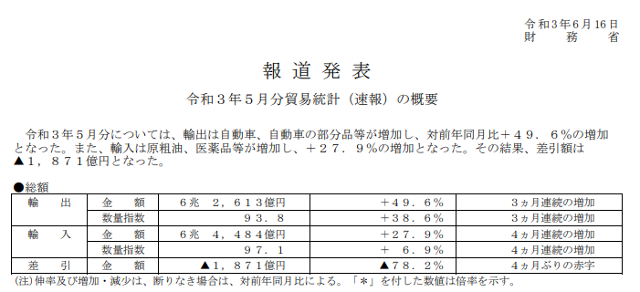 据日本非官方小道消息获悉:2021年5月,日本关税征收总额同比去年几近翻倍。在日本关税税率几乎没有调整的情况下,日本关务如何实现这一奇迹的?是日本进出口贸易总额也激增翻倍了吗?翻出日本财务省官网的贸易统计数据,我们可以看到:2021年5月,日本的出口贸易总额为62613亿日元,同比增长了49.6%;进口总额为64484亿日元,同比增长了27.9%;进出口贸易总额合计127097亿日元,同比去年增长