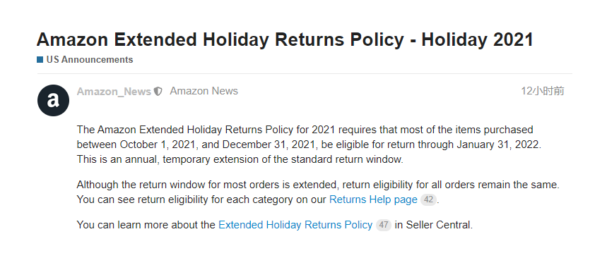 实际上,这次的政策变动并非偶然,每年节假日亚马逊都会相应地延长退货期限,便于消费者节日后退货。但不同的是,往年亚马逊的假期政策一般从年底11月开始实施,然而从去年开始,亚马逊则将开始日期从原来的11月1日提前到了10月1日。