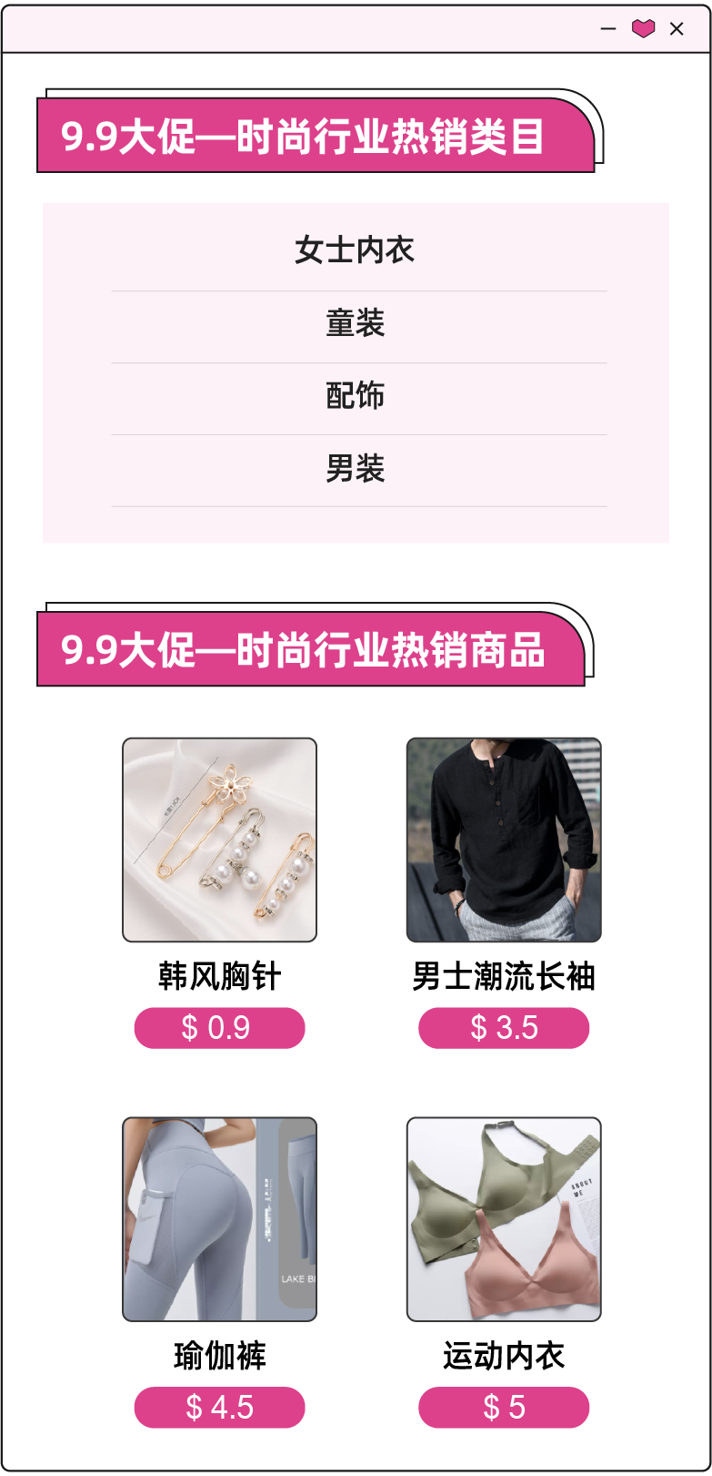 童装是时尚行业高速增长的潜力类目。在今年9.9大促的数据中,多个拥有优质供应链的童鞋商家表现非凡,凭借高性价比的产品爆发,冲至类目头部。伴随季节交替,本次大促中男女秋冬装的销量也开始加速增长,长袖T-Shirt/Tops, 毛线开衫,轻薄外套等表现不俗。女性发饰/饰品也都在六国有爆发式增长,订单量对比Bday增幅127%。此前销量较为平均的贵重珠宝首饰、高价值手表、舒适型内衣裤以及瑜伽运动服,在本次活动中均有较大突破。