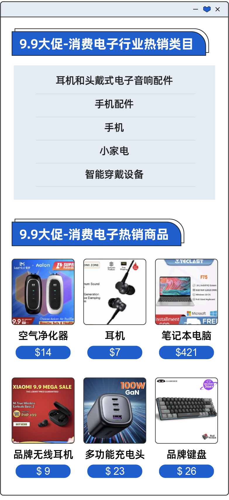 随着东南亚互联网经济近几年的飞速发展,智能手机、电脑等电子产品作为互联网产业的生产力,在生活和工作场景中普及。与之匹配的电子配件销量也随之涨高,在本次9.9大促中,过去较为冷门的蓝牙音响、键鼠、手机壳、充电线等电脑配件产品在闪购上也刷新了历史表现。