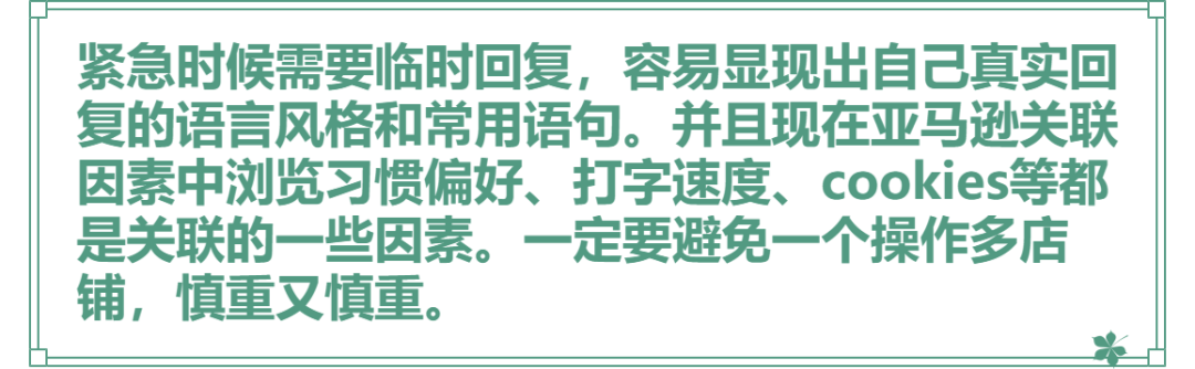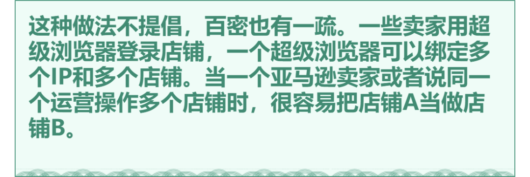 1.一人操作多个店铺关联风险(弱关联)比如说,我们经常复制ASIN、SKU、订单号、FBA编码到后台搜索查询。一旦我们在超级浏览器中同时把多个店铺页面打开,很容易进错店铺搜索这些信息,当看到无结果才想起来进错了店铺。另外,每个运营回复卖家消息都会有自己独特的语言组织,但是如果同时操作多个店铺,即使你有多个版本的回复模板,也很容易搞混淆。2.登录后台开VPN登录后台不要开VPN,开VPN不要登录后台