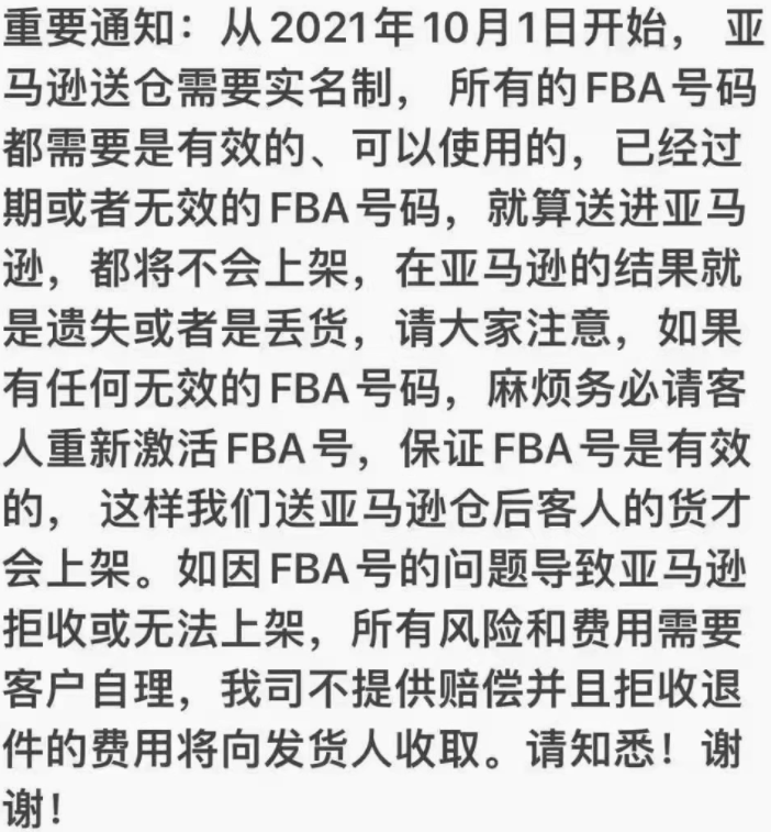 根据卖家社群内消息显示,"从10/1/2021开始,亚马逊送仓必须实名制,送仓的货件FBA编号必须正确对应,否则将无法上架。"