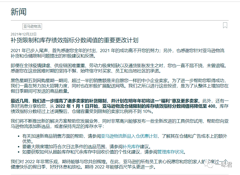 2021年12月22日,亚马逊一则新闻:亚马逊发布补货限制和库存绩效指标分数阈值的重要更改计划,引发讨论,我们先来看这则新闻的内容: