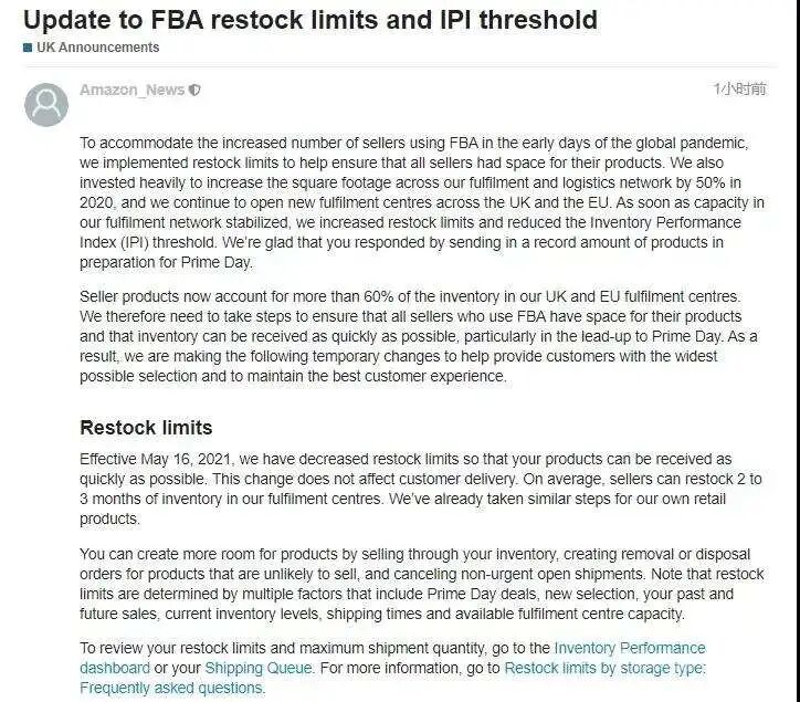 亚马逊放宽补货限制,IPI阈值降为400!