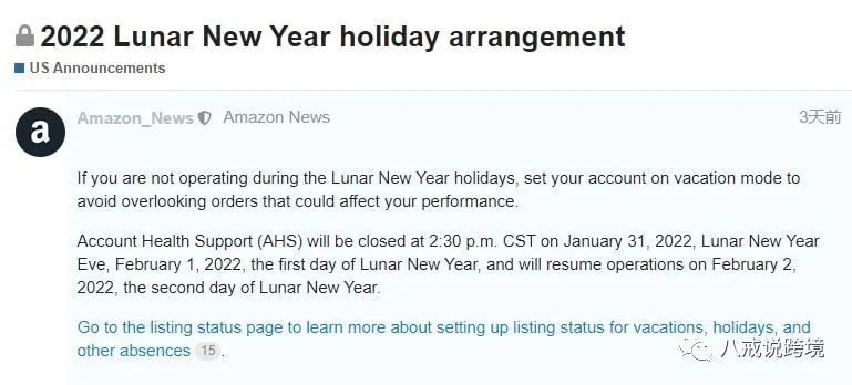 针对中国特有的节日风俗,亚马逊美国站和欧洲站特别发布了一则《2022年农历新年假期安排》的公告,提醒中国卖家在春节假期需要注意的相关事项。