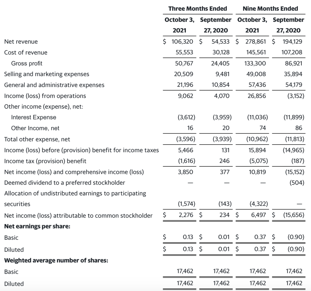 Lulu's在2021年第三季度净收入为1.063亿美元,同比增长几乎翻倍,达到95%,净收入 230万美元,同比增长高达921%,调整后 EBITDA 为1190万美元,同比增长126%。