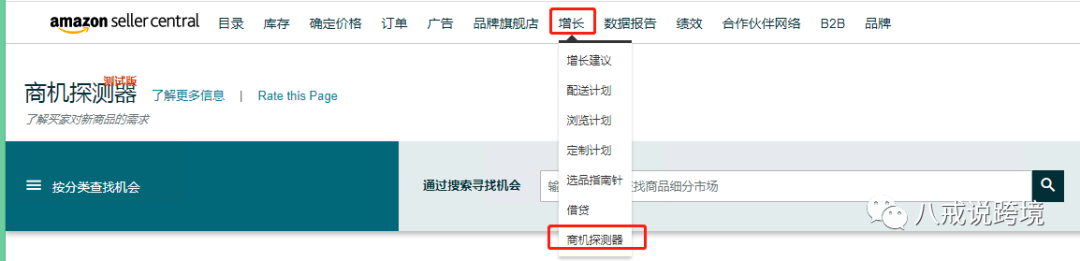 在哪里可以找出"商机探测器"?打开店铺后台 - 增长 - 商机探测器。目前该功能只针对主账号开放,所以没有找到该功能的卖家再耐心等等。也可以通过邮件申请开通:用注册邮箱给亚马逊联系邮箱发送邮件:opportunity-explorer-request@amazon.com。
