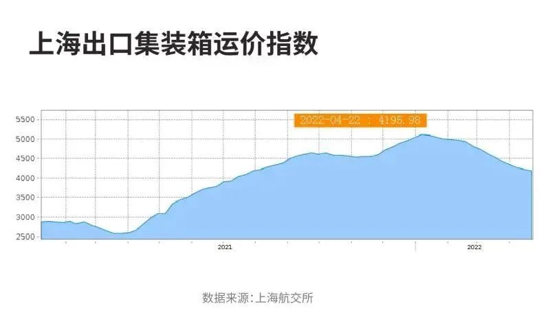4月22日,上海航交所数据显示,最新上海出口集装箱运价指数较上周续跌32.67点至4195.98点,呈现连续14周的下跌,运价指数目前回落到去年8月之前的水平。