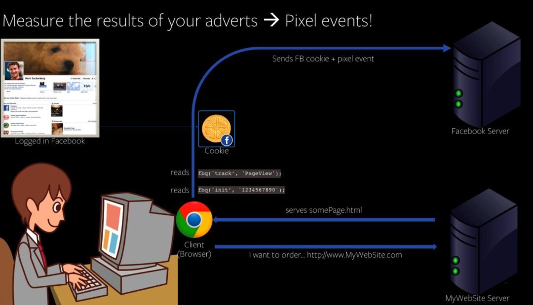 用户在商品页面进行购买的操作,Facebook可以在浏览器上记录用户的Cookie,最后电子商务平台会给后台管理者反馈一个网页,里面包含用户Cookie及像素触发事件,管理者就能清楚地了解到用户的基本信息及行为数据。