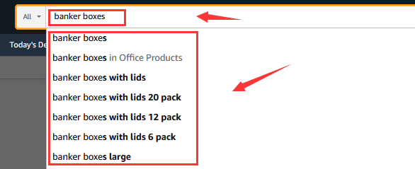 原来搜索某个关键词时,亚马逊在下拉框里面会推荐很多跟搜索词相关的长尾关键词,搜索框一般是这样的: