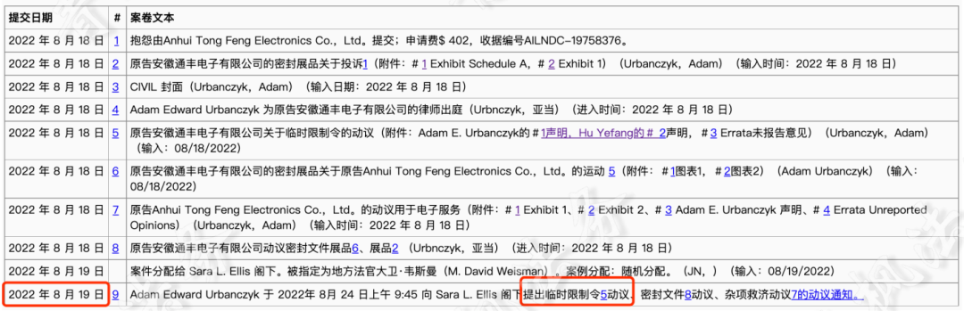 起诉时间:2022年8月18日案件号:22-cv-4407代理律所:Adam Edward Urbanczyk(Au LLC)受理法院:伊利诺伊州北区地方法院原告:Anhui Tong Feng Electronics Co., Ltd.原告官网 >案件进展:8月18日提交诉讼,尚未开始TRO冻结。