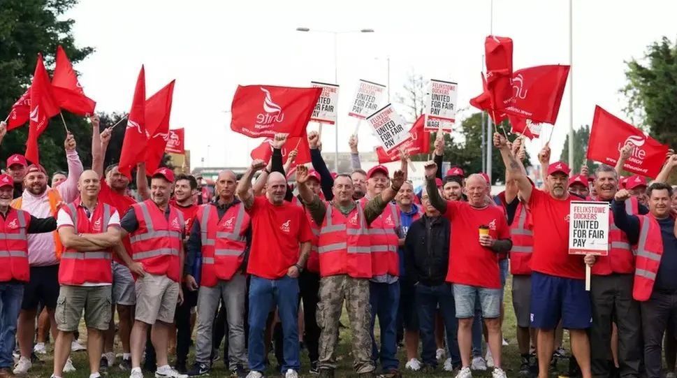 8月,英国深陷工人罢工潮,据英国媒体报道,由于通货膨胀上升和收入水平下降,工资增长不及物价增长,从而导致民众生活压力巨大,引发英国费利克斯托港口近2000工人罢工,并要求提高工资酬劳,罢工计划从当地时间8月21日持续到8月29日。这是费利克斯托港30年来的第一次罢工,也是该行业30年以来最大规模的罢工行动。