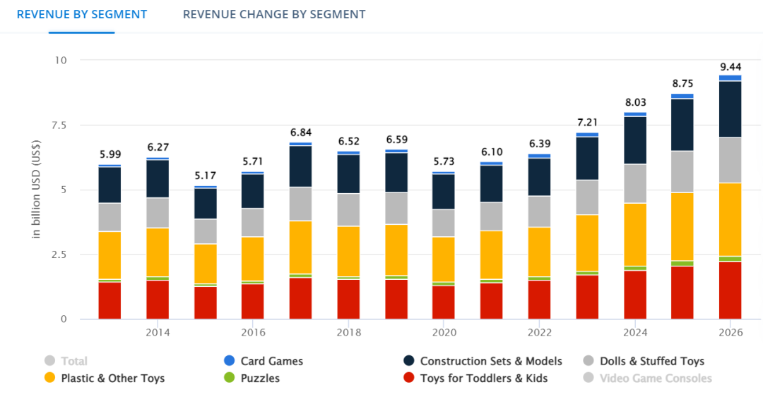 其中,新兴国家市场的活力愈发旺盛,玩具消费观念走向成熟。根据Statista提供的数据,2021年巴西玩具市场零售总规模61亿美元,线上5亿美元,至2025年线上渗透率将翻倍。
