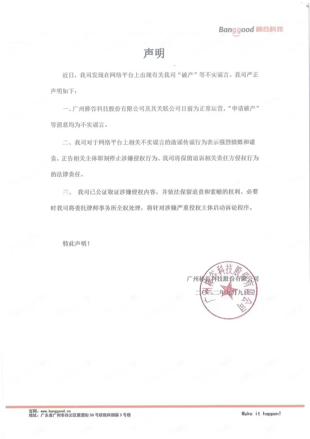 近日,网络上流传关于棒谷科技Banggood申请破产的传闻在跨境电商圈火热传播,对此,棒谷科技发布声明称棒谷科技股份有限公司及其关联公司目前为正常运营状态,"申请破产"等消息均为谣言。