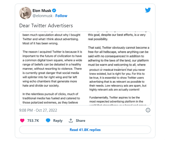为了安抚广告商们,马斯克向他们发出了一封公开信,指出收购推特是为了拥有自由发表言论的平台,对未来文明非常重要。如果能在法律和商业之前取得平衡,广告完全可以达到"娱乐、推广和信息传递"这三重作用。