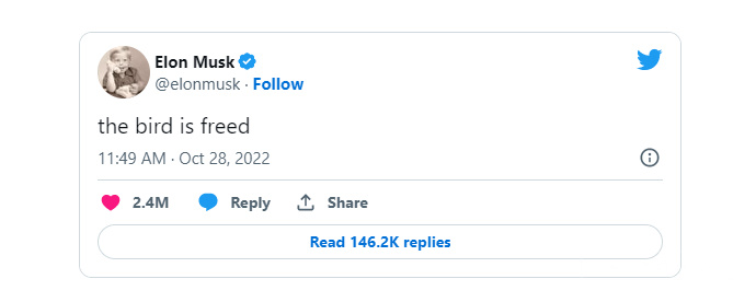 马斯克自允为"言论自由绝对主义者",在收购推特的几个小时前,马斯克还公开表明不希望推特成为"自由放纵的地狱",并且有意改变推特的内容审查机制,立志将推特打造成向所有人敞开的自由平台。