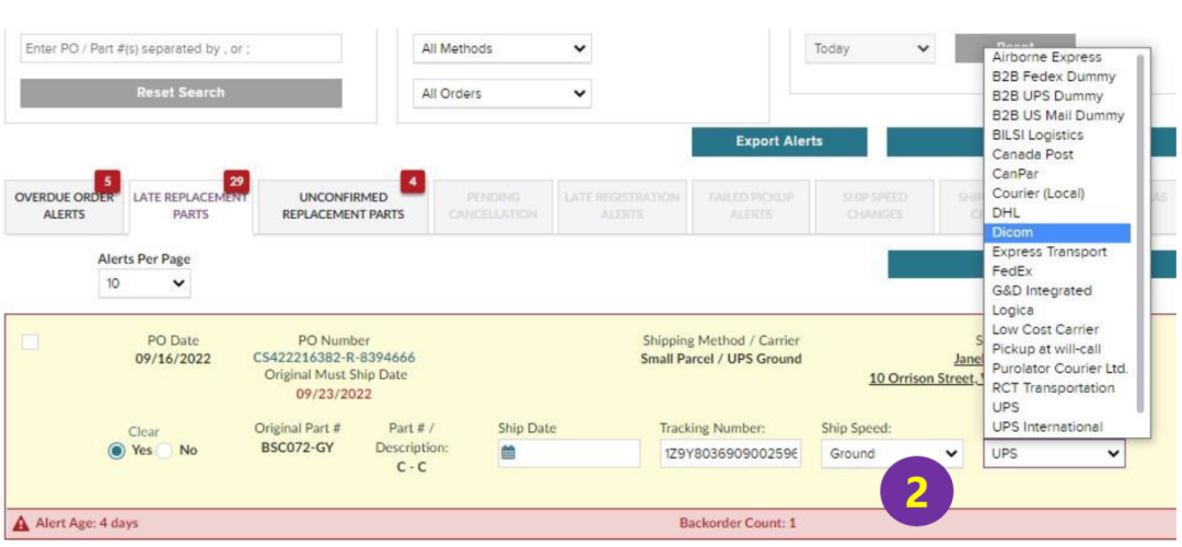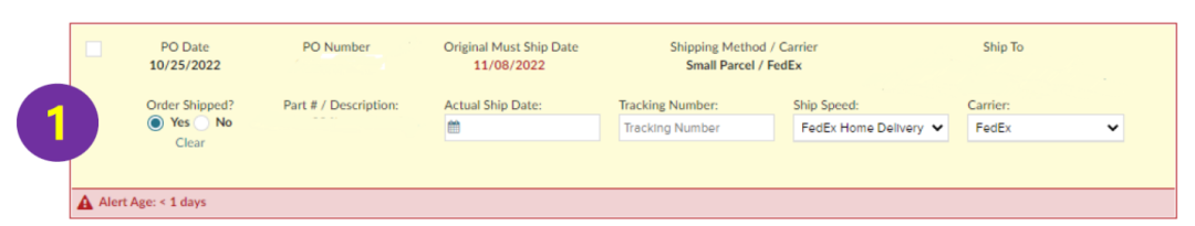 但如果您遇到不得已的特殊情况,生米已然煮成了熟饭。那您只能等待该订单逾期后,方能通过Partner Home,选择All Order Alerts 中Overdue Orders, 搜索 PO单号, 在"Order Shipped?"下选择 "Yes",并输入"Actual Ship Date","Tracking Number",选择您实际使用的"Carrier",再点击右上角的蓝色 "Save Changes" 就可以清除警报,并更新物流信息啦~ (具体操作您可以参考下图)