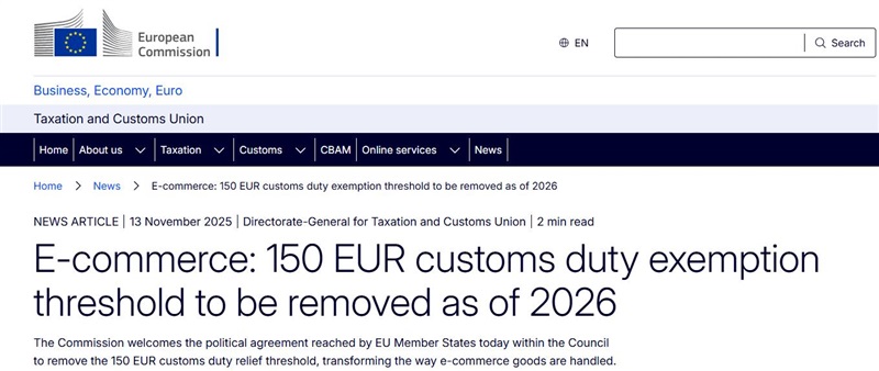 值得注意的是,除了确定取消小额关税豁免,欧盟还批准了一项2026年过渡性的反欺诈措施,用来遏制未来两年可能出现的虚报价格、拆分包裹等滥用行为。具体要求尚未公开。