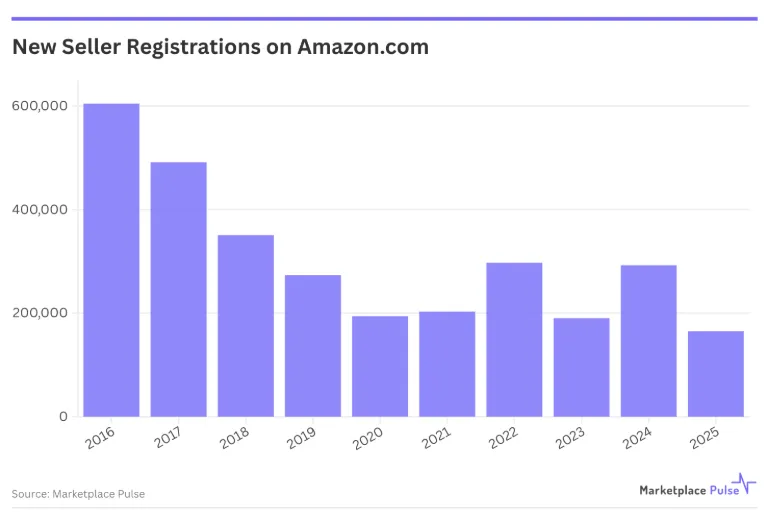 核心数据显示亚马逊全球新注册卖家数量仅 16.5 万名,创下近十年最低纪录,较 2024 年的 25 万名同比大幅下降 44%,这一数据既反映出老卖家不再新增店铺,也体现了潜在新卖家入行意愿的显著降温。