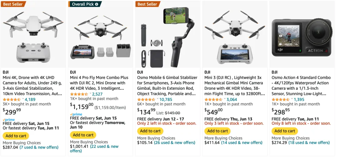 在亚马逊,DJI Mini 4 Pro单品售价超过1100美金,每月销量依然超过1000套。更不用说,品牌旗下还有多款产品,在亚马逊无人机类目都是BestSeller级别。