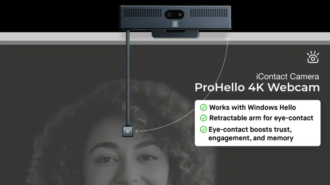 iContact Camera 是由视频导演打造的创新 webcam 系列,核心解决线上沟通中 "看似对视却实则低头" 的痛点,包含基础版和 Pro/ProHello 升级款。其通过独特设计将摄像头置于屏幕视线平齐位置,搭配高感光传感器与适配性支架,无需额外软件,即插即用适配电脑与主流视频平台。