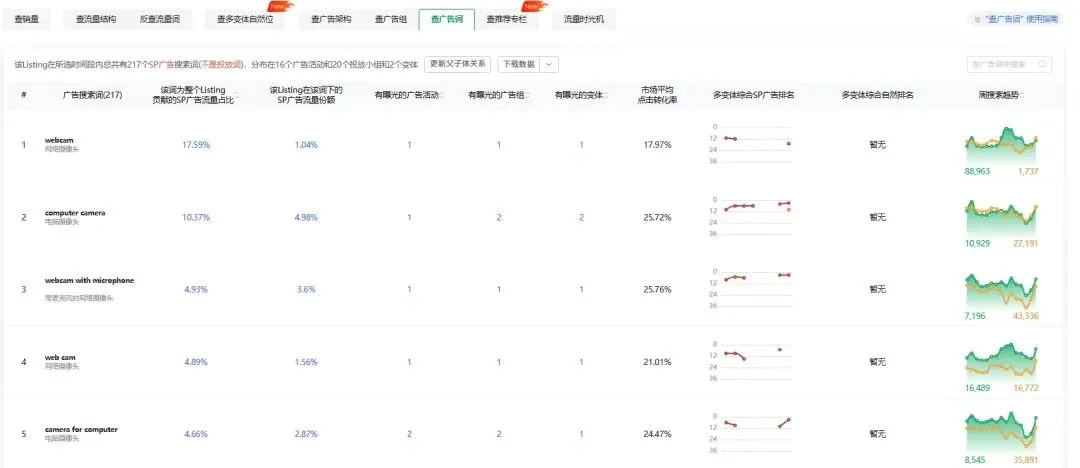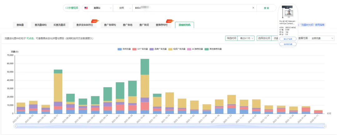 从市场数据维度看,iContact Camera 的投诉动作其实暗藏销售压力 —— 借助 sif 关键词的流量时光机功能可清晰看到,这款 ASIN自 2024 年 11 月上架后,基础版、Pro 款的订单量曾稳定增长,甚至在 2025 年 4 月达到月销 500 + 的峰值,核心自然词 "iContact camera pro" 的流量占比一度高达 37.42%,广告端也以 "webcam""computer camera" 等关键词持续获量。