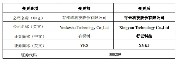 据公司公告,有棵树科技股份有限公司已完成董事会审议,拟将公司名称变更为行云科技股份有限公司。证券简称也将从"有棵树"改为"行云科技",证券代码300209保持不变。